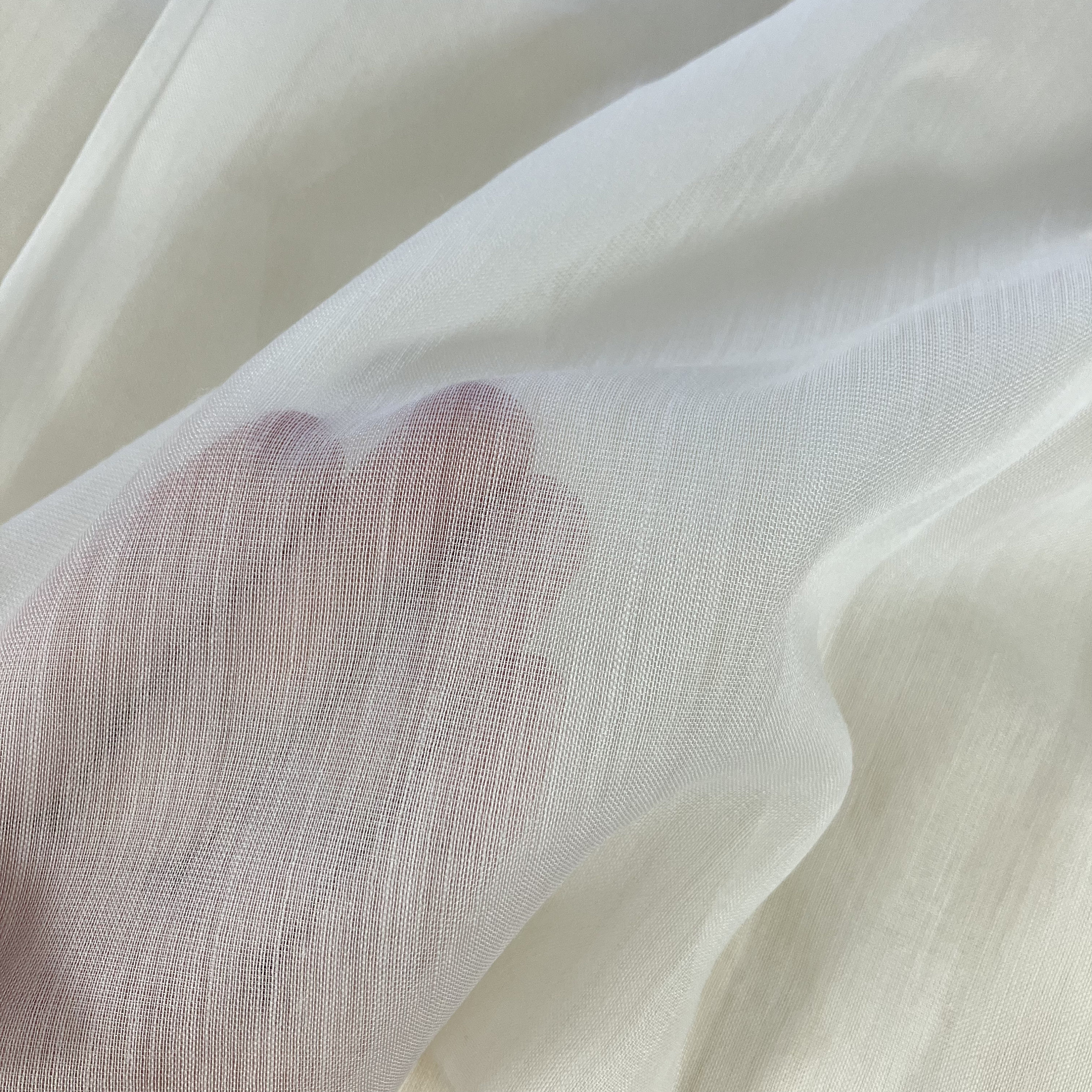 Silk wool voile is a luxurious, sheer, lightweight fabric blending fine silk and wool for softness, breathability, and elegant drape, perfect for airy dresses, blouses, scarves, or delicate linings, combining the luster of silk with wool's warmth and structure in a delicate, often semi-transparent weave.